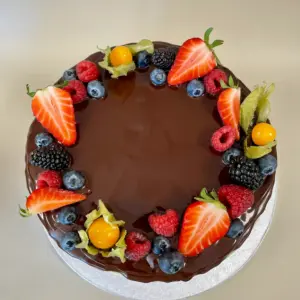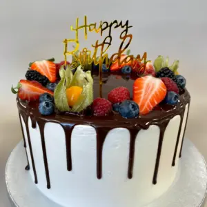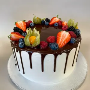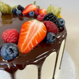 Drip Cake mit Schokodrip und frischen Früchten dekoriert.