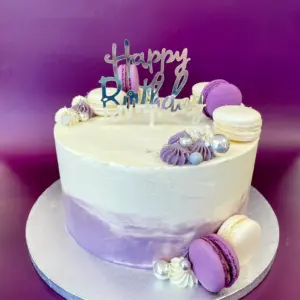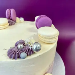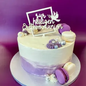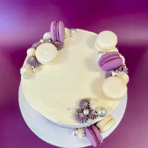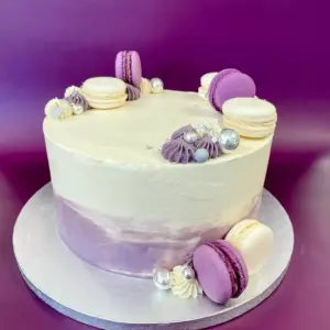 Torte mit Farbverlauf und passenden Macarons dekoriert, die Farbe kannst du gerne frei wählen.