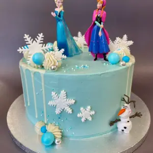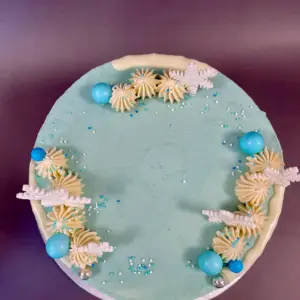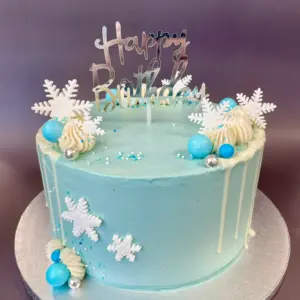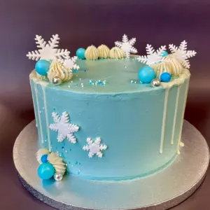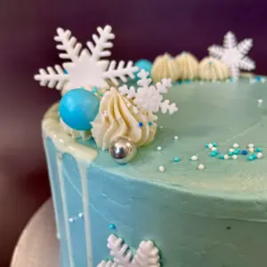 Torte mit weißem Schoko-Drip punktuell, Schneeflocken und Streuseln dekoriert. Optional mit Spielfiguren.
