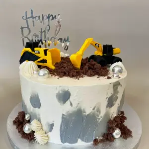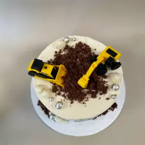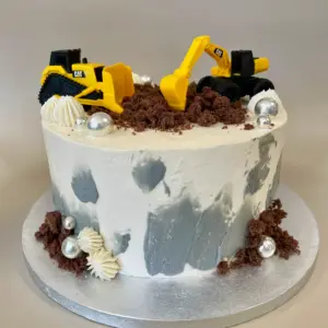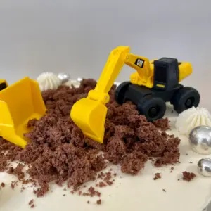 Torte mit 2 Spielfahrzeugen (nicht essbar) und Kuchenbrösel dekoriert.